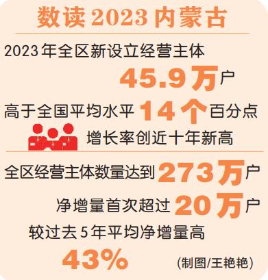 经营主体迸发出新活力。2023年,自治区市场监管局出台便捷市场准入助力招商引资九条措施,取消、下放行政审批事项26项,减少环节113个。个体工商户设立登记等31项、589项具体项目实现全区通办,申请人可以在“家门口”办“外地事”,全区经营主体呈现数量增长、结构优化、活跃度提升的良好态势。2023年全区新设立经营主体45.9万户,高于全国平均水平14个百分点,增长率创近十年新高;全区经营主体数量达到273万户,净增量首次超过20万户,较过去五年平均净增量高43%。在培育壮大经营主体上,集成金融、用工、创新等各领域15条硬措施落地,小微企业和个体工商户总量分别增长7.59%和7.3%。在激发经营主体创新活力上,推动“一站式”服务进园区、进企业,服务企业44761家,减免费用、节约成本7154万元。“蒙”字标认证带动377种产品实现增值,知识产权质押融资达到48.21亿元。