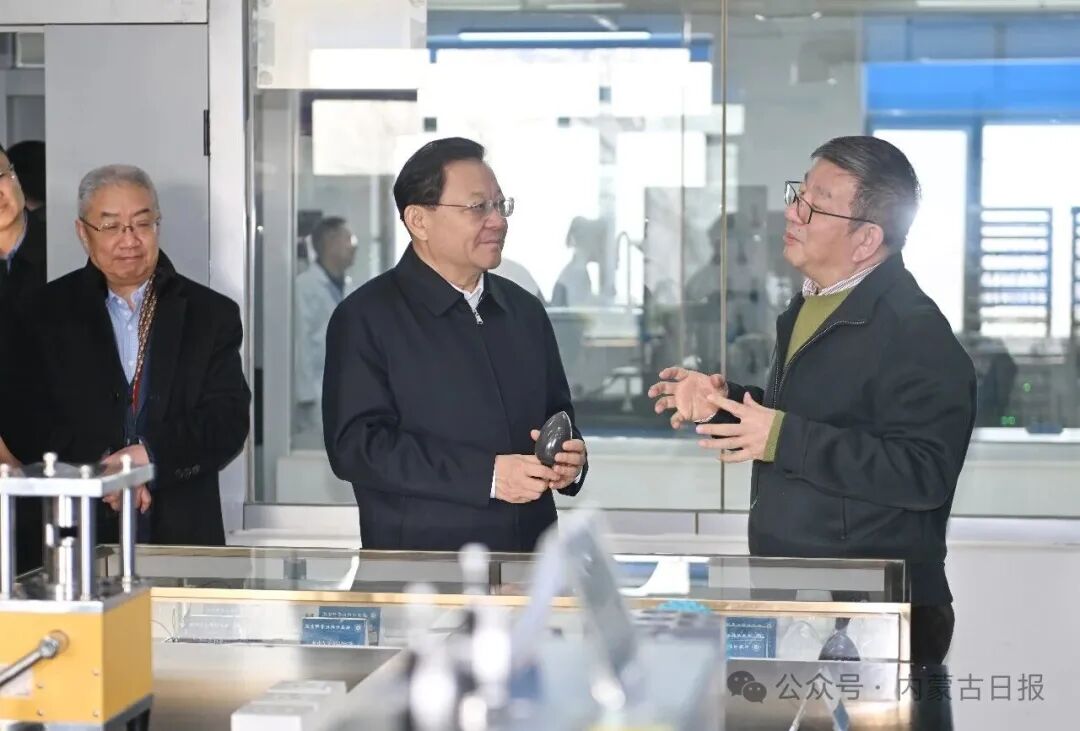 12月16日,自治区党委书记王伟中走进功能介孔材料实验室,认真听取高寒地区电池储能系统研发等进展情况介绍。草原云·内蒙古新闻网记者 马建兵 摄